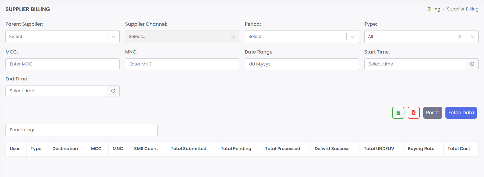 · Supplier Channel: Filter by specific SMPP gateway channel.