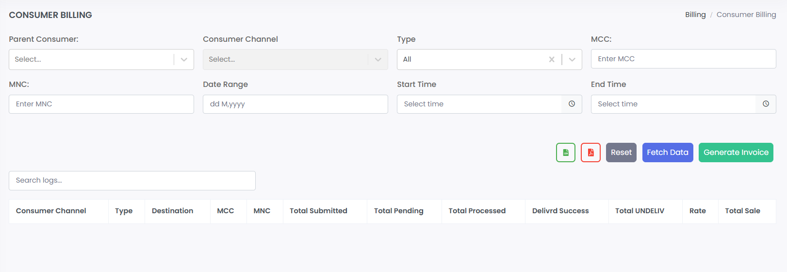 · Columns: Consumer Channel, Type, Destination, MCC, MNC, Total Submitted, Total Pending, Total Processed, Delivered Success, Total UNDELIV, Rate, Total Sale.