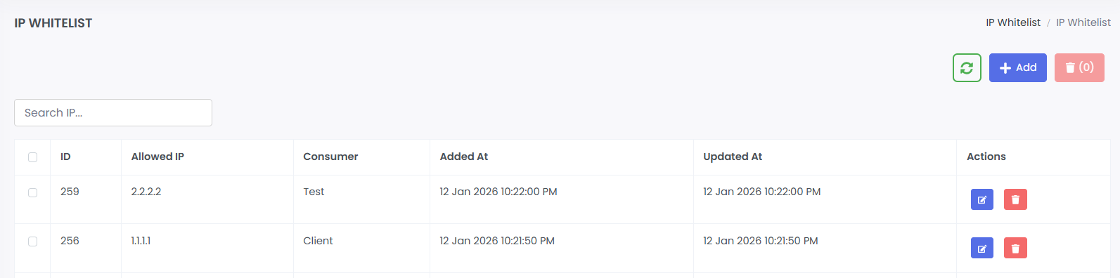 · Columns: ID, Allowed IP, Consumer, Added At, Updated At, Actions.