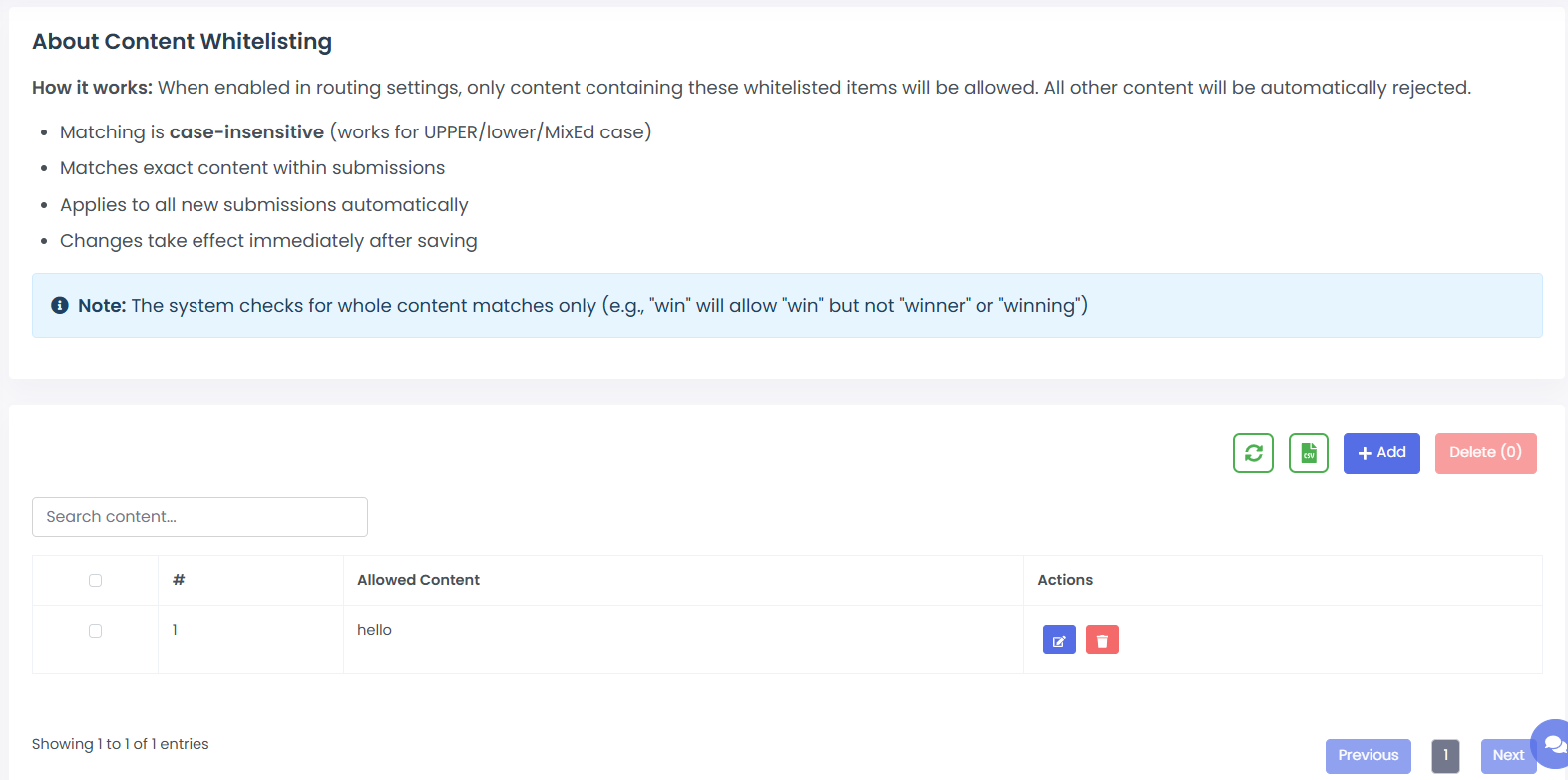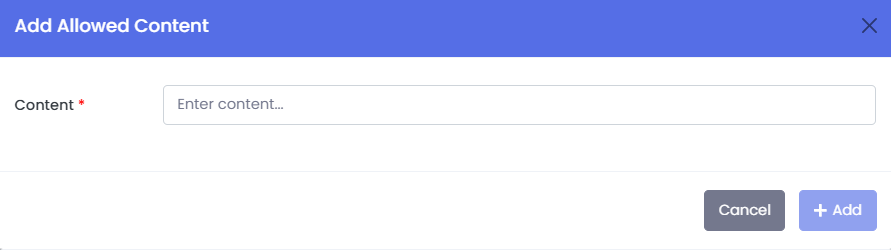 · Columns: #, Allowed Content, Actions.