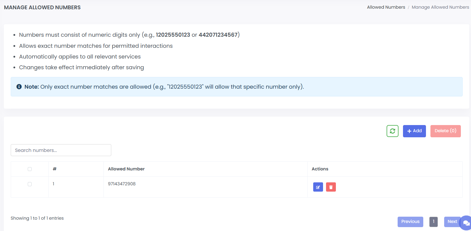 · Pre-filled form to update an existing allowed number (same as Add form).