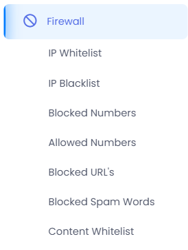 The Firewall section manages security and access control rules for the SMS platform. It includes filters for IPs, numbers, URLs, and content to prevent abuse and ensure secure message routing.