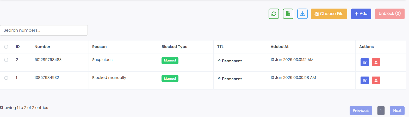 · Columns: ID, Number, Reason, Blocked Type, TTL, Added At, Actions.