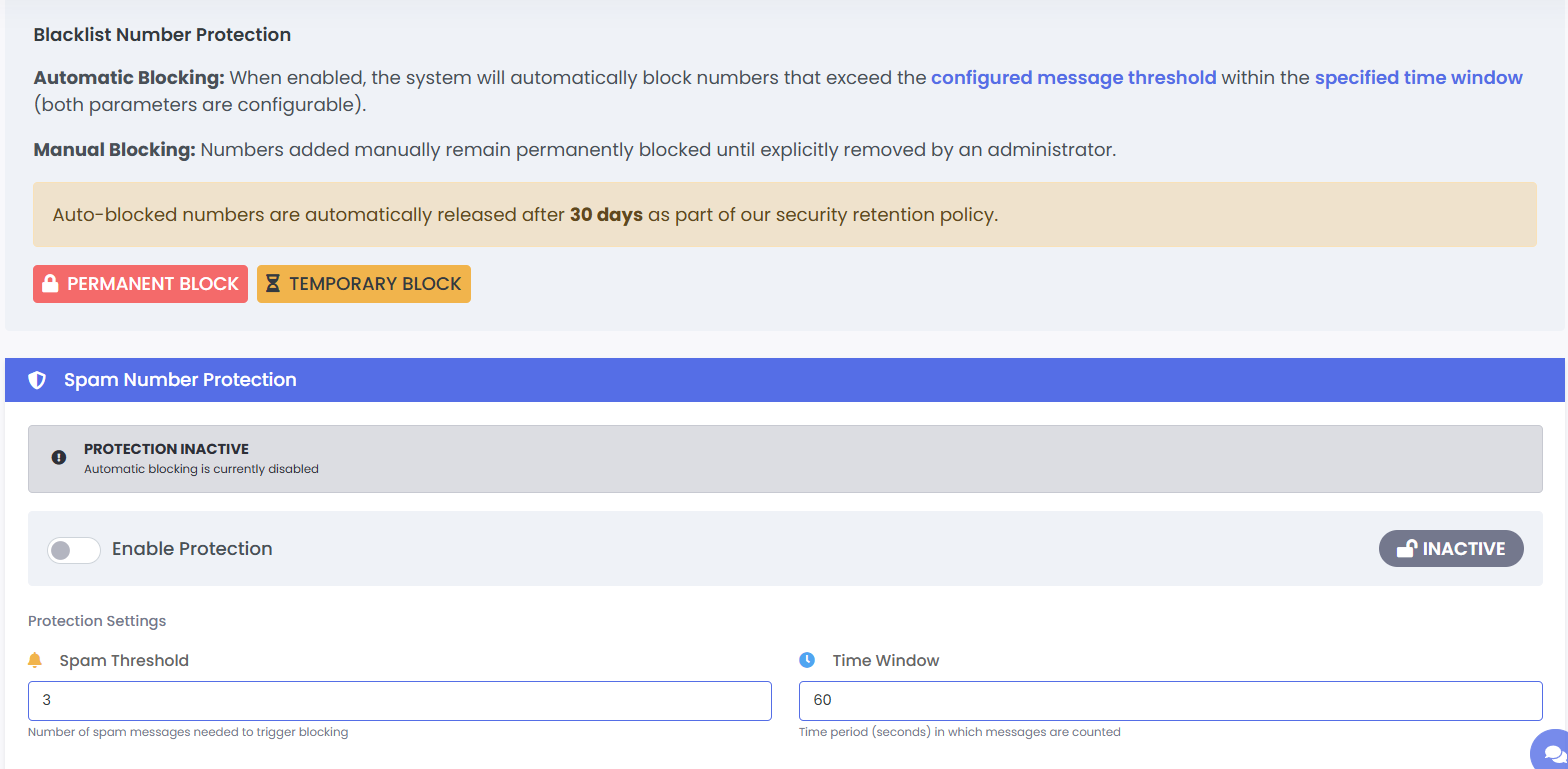 · Spam Threshold: Number of messages allowed before auto-block (e.g., 3).
