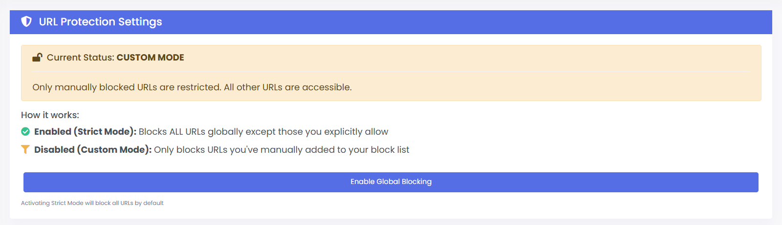 · Strict Mode: Blocks all URLs globally except those explicitly allowed.