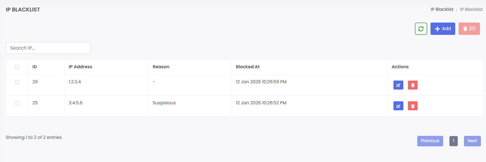 · Columns: ID, IP Address, Reason, Blocked At, Actions.