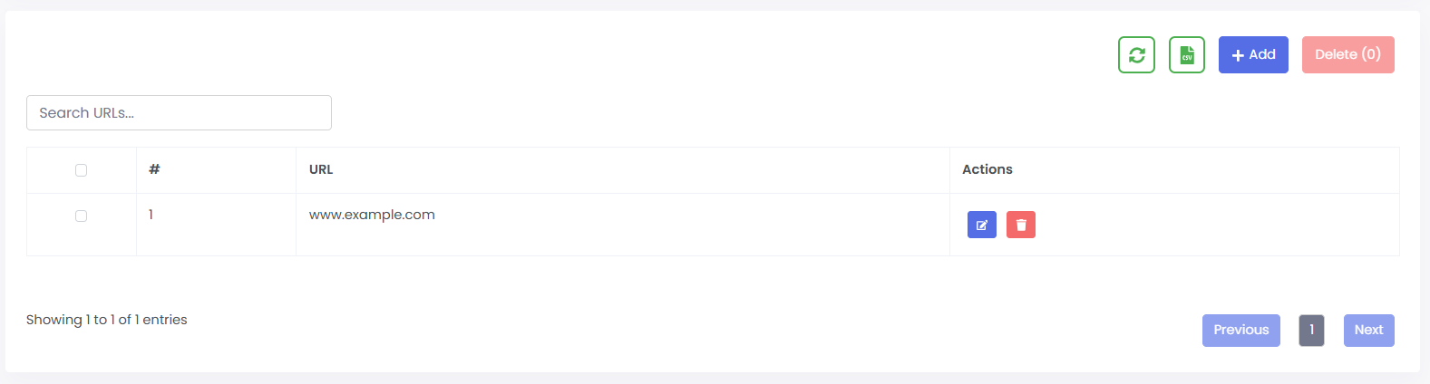 · Columns: #, URL, Actions.