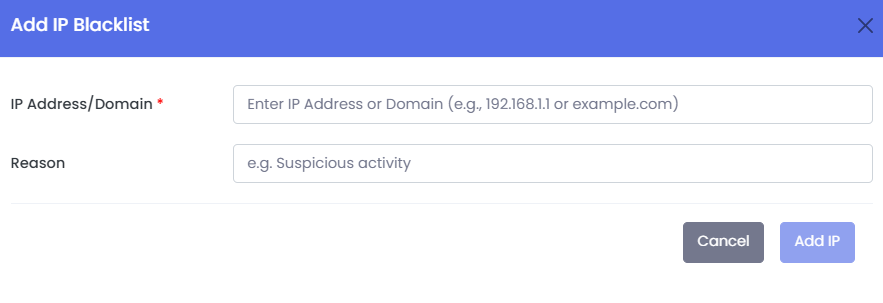 · Form to block a new IP or domain.