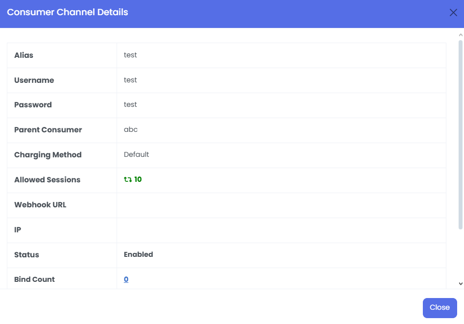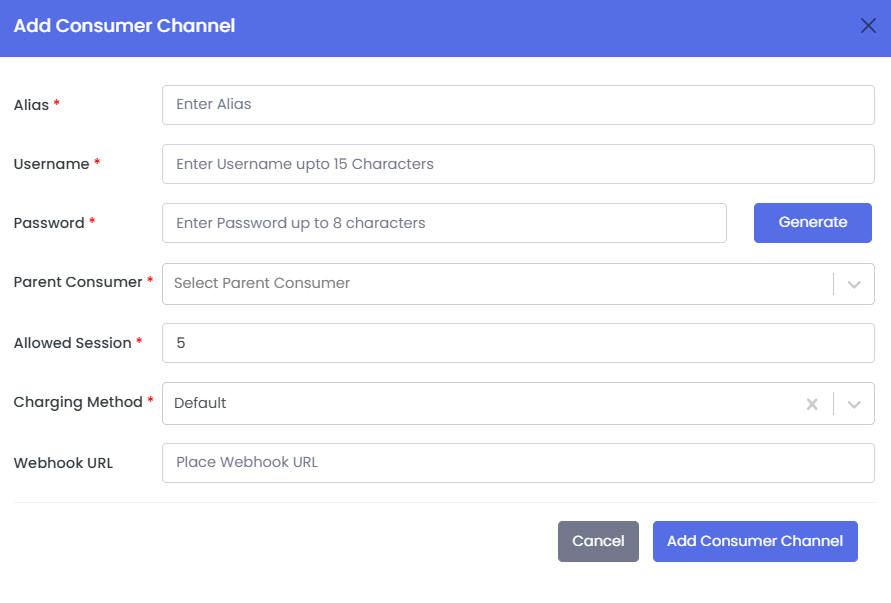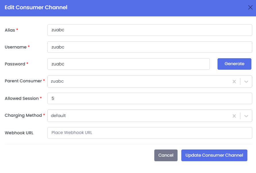 · Editable fields include Alias, Username, Password, Parent Consumer, Allowed Session, Charging Method, Webhook URL.