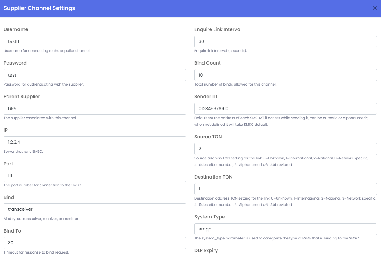 Location: Sidebar → SMPP Channels → Supplier Channel