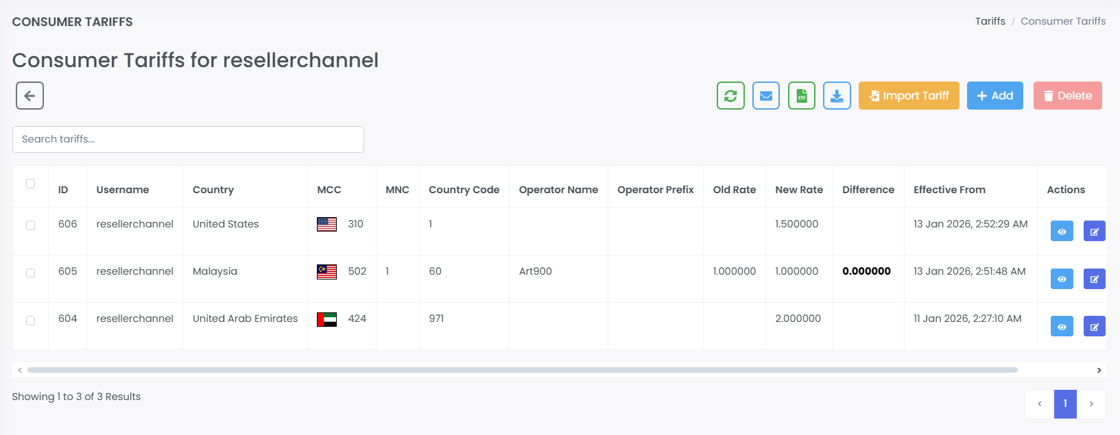 · Import/Export: Bulk upload/download of tariff lists via file (CSV/Excel).