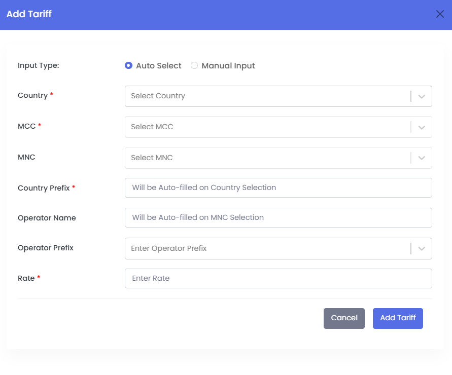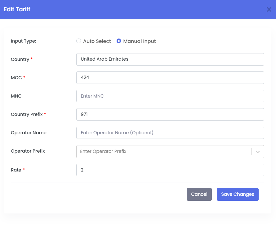 · Fields: Input Type (Auto/Manual), Country, MCC, MNC, Country Prefix, Operator Name, Operator Prefix, Rate.